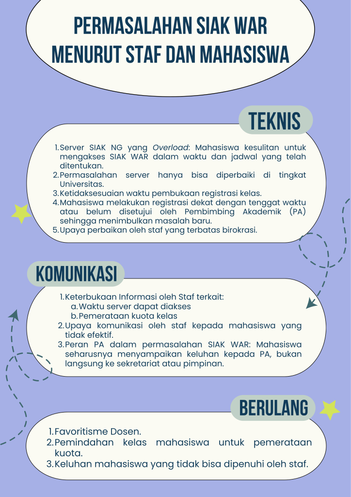 Komunikasi menjadi salah satu faktor utama dalam permasalahan SIAK WAR. Komunikasi dan keterbukaan informasi dari seluruh pihak yang terlibat yaitu mahasiswa, program studi, fakultas, dan universitas sangat diperlukan untuk membuat pengalaman registrasi kelas online yang terbaik bagi mahasiswa dan staf tenaga kependidikan.
