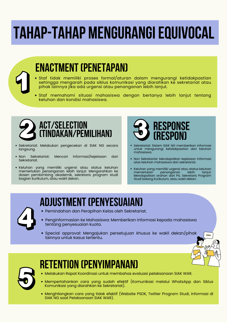 Dalam tahap Adjustment, sekretariat melakukan pemindahan dan penataan ulang kelas serta memberi informasi kepada mahasiswa tentang penyesuaian kuota, sementara kasus khusus memerlukan persetujuan dari dekan atau pihak lainnya. Terakhir, pada tahap Retention, mereka menyimpan data dan hasil evaluasi dalam rapat koordinasi di Google Drive, serta mempertahankan metode komunikasi yang efektif seperti WhatsApp, sambil menghilangkan cara yang kurang efektif seperti penggunaan Twitter sesuai dengan konsep Success. Melalui siklus komunikasi ini, sesuai dengan prinsip nomor 3, terlihat bahwa semakin banyak siklus komunikasi yang dilakukan, semakin banyak ketidakpastian yang dapat dikurangi oleh staf tenaga kependidikan. Tahap ini juga menunjukkan bahwa organisasi melakukan Penyesuaian dan Adaptasi Dengan Lingkungan.