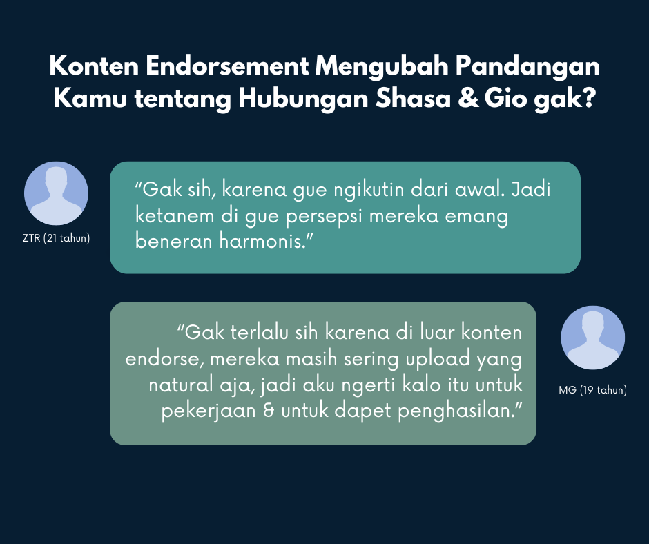 Selain itu, ditemukan juga bahwa konten bermuatan endorseternyata tidak memengaruhi pandangan terkait keharmonisan hubungan romansa yang ditampilkan akun @_shaz oleh informan ZTR dan MG.