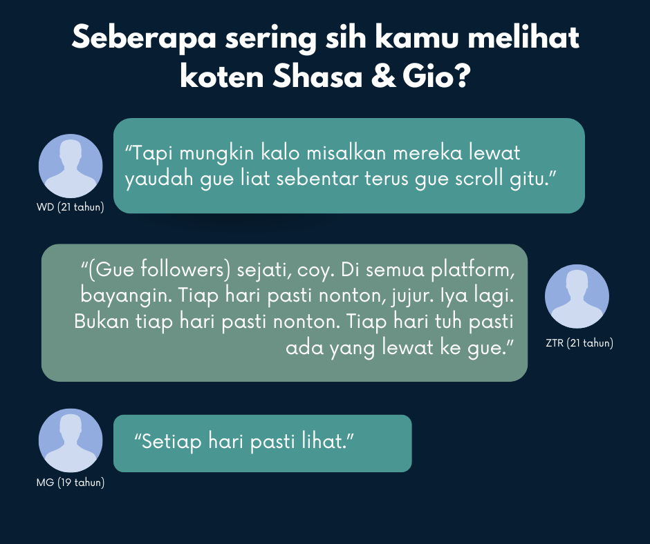 Sedangkan untuk frekuensi paparan konten Shasa Zhania dan Gio terbagi atas dua kategori, yakni low exposure audiencedan high exposure audience.Pembagian kedua kategori ini akan berpengaruh ke bagaimana para khalayak memaknai, menilai, dan mengimplementasikan apa yang mereka konsumsi pada media sosial terhadap kehidupan nyata mereka. Perbedaan dari kedua kategori ini bisa terlihat pada khalayak yang mengikuti akun Shasa Zhania dan tidak mengikuti akun Shasa Zhania pada media sosial TikTok. Tentu saja mereka yang tidak mengikuti akun Shasa Zhania pada TikTok akan kurang terpapar oleh konten Shasa Zhania sehingga dapat disebut sebagai low exposure audience.Pada penelitian ini, informan WD termasuk ke dalam low exposure audience karena Ia tidak mengikuti dan hanya mengandalkan algoritma TikTok-nya untuk mengonsumsi konten Shasa Zhania dan Gio.Melainkan sebaliknya, mereka yang mengikuti akun Shasa Zhania pada TikTok akan lebih sering terpapar oleh konten yang dibuat dan diunggah oleh Shasa Zhania, dan menjadikannya termasuk ke dalam kategori high exposure audience. Yang pada penelitian ini, informan MG dan ZTR termasuk ke dalam high exposure audience dikarenakan mereka mengikuti akun Shasa Zhania dan aktif dalam mengonsumsi konten yang diunggah oleh Shasa Zhania pada media sosial TikTok.