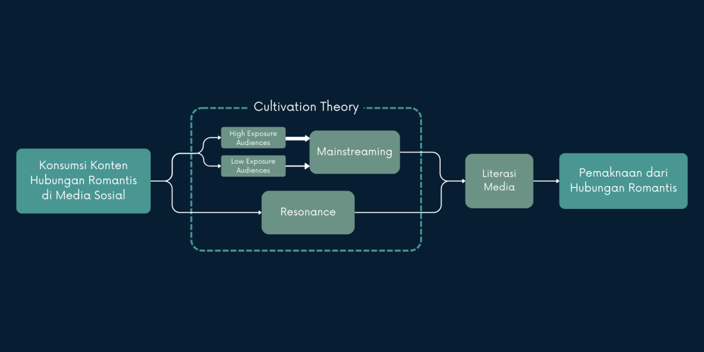 Menggunakan teori dan konsep tersebut, penelitian ini ingin melihat bagaimana konsumsi dan pemaparan dari konten-konten romantis pada platform TikTok dapat memengaruhi pemaknaan individu mengenai hubungan romantis. Berdasarkan pada teori kultivasi, dua hal utama yang memengaruhi interpretasi khalayak merupakan mainstreaming dan resonance. Mainstreaming menyatakan bahwa khalayak yang sering mengonsumsi (high exposure audiences) konten-konten romantis pada akun @_shaz akan memiliki kecenderungan lebih besar untuk mengikuti dan mengadopsi definisi hubungan romantis dari apa yang ditunjukkan oleh Shasa Zhania dan Gio. Sementara itu, resonance menyatakan bahwa untuk seseorang dapat menerima dan menginternalisasi pesan, pesan tersebut harus sesuai dan selaras (resonate) dengan pemahaman yang sudah dimiliki oleh khalayak. Gabungan dari kedua konsep tersebut kemudian dipengaruhi juga oleh konsep literasi media, di mana kemahiran khalayak dalam mengakses dan menganalisis konten media memengaruhi bagaimana mereka akan menyikapi dan menginternalisasikan pesan tersebut ke kehidupan mereka.