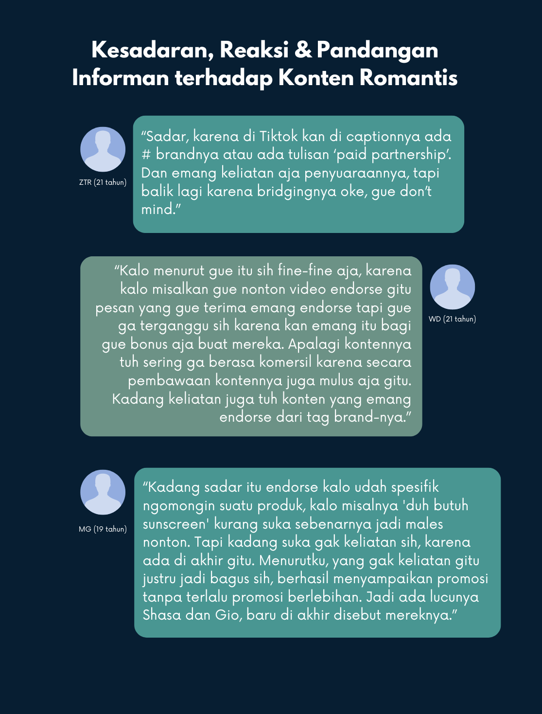 Kedua, terkait kesadaran, reaksi, dan pandangan informan terhadap konten romantis milik akun TikTok @_shaz yang bermuatan endorse (sponsored content).Berdasarkan hasil wawancara terhadap informan ditemukan bahwa ketiganya menyadari apabila sebuah konten bermuatan endorse (sponsored content).