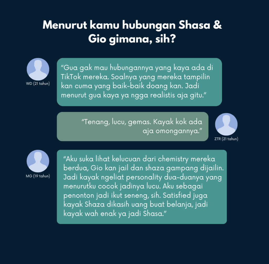 Citra positif ini juga ditampilkan dalam konteks konten yang berkaitan dengan hubungan romansa. Salah satunya terlihat dari Akun TikTok @_shaz atau yang dikenal dengan Shasa Zhania–seorang public figure yang sering membagikan momen romantis bersama pasangannya, Gio. Meskipun demikian, umpan balik terhadap hubungan romansa yang ditampilkan akun TikTok @_shaz ternyata sangat beragam, dari komentar yang bersifat positif, netral, hingga skeptis.