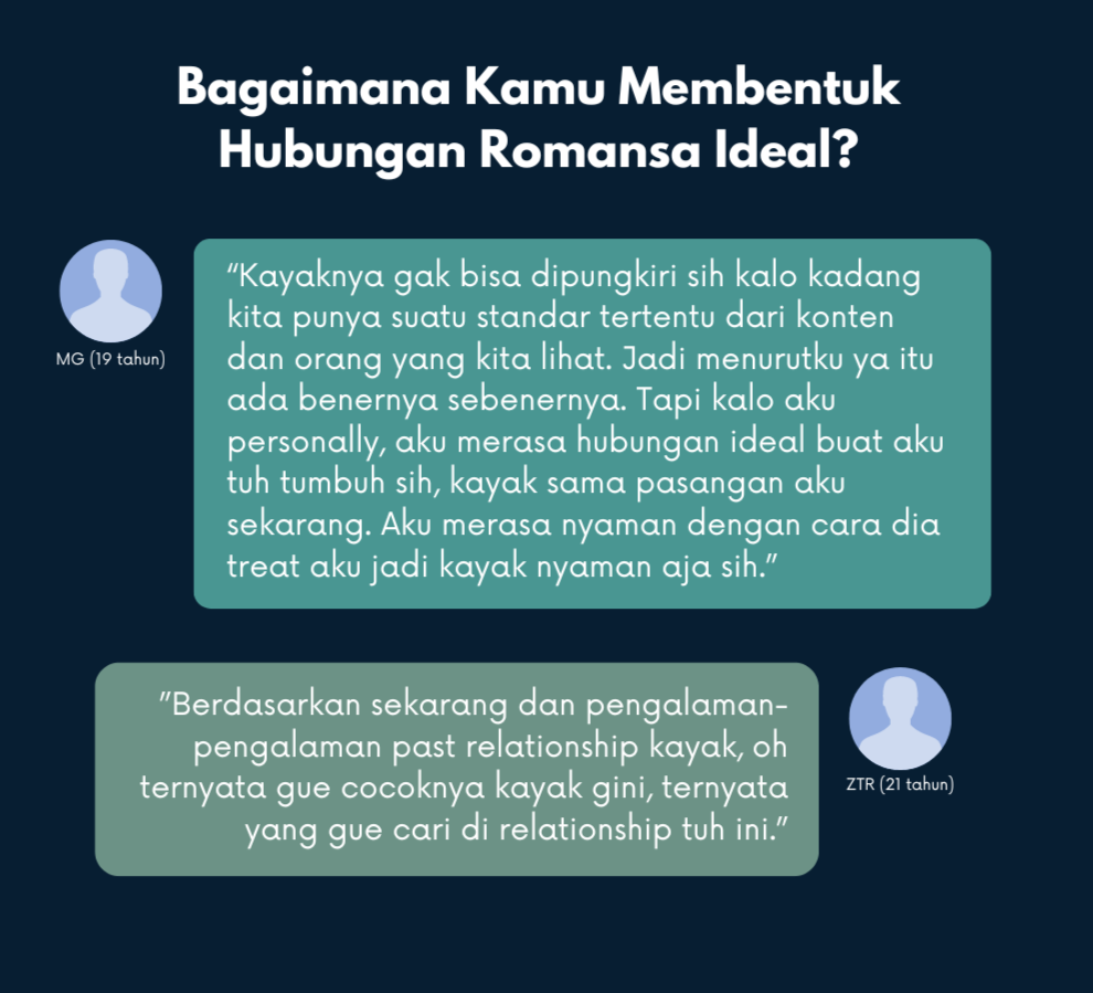 Kemudian, dalam penelitian ini ditemukan juga bahwa paparan konten hubungan romansa bukanlah satu-satunya faktor yang membentuk makna atas hubungan romansa yang diharapkan, tetapi pengalaman pribadi juga turut berkontribusi.