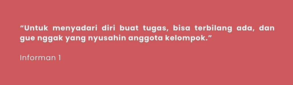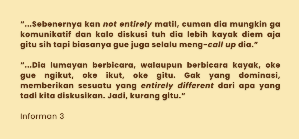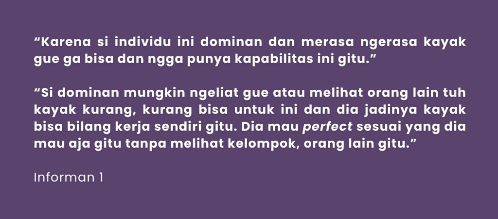 Informan 1 juga menyatakan persepsinya terhadap anggota kelompok lainnya yang memiliki kemampuan lebih sehingga membuat Informan 1 menahan diri dan enggan berkontribusi lebih lanjut hingga Informan 1 diminta. Informan 1 juga enggan menjadi dominan dalam kelompok seperti pernyataannya “Gue kadang juga nggak pede buat jadi yang dominan di kelompok.” sehingga membiarkan anggota lainnya yang berinisiatif dan mendominasi dalam kelompok.