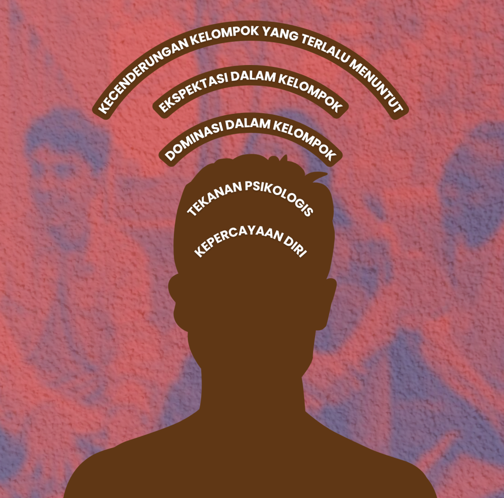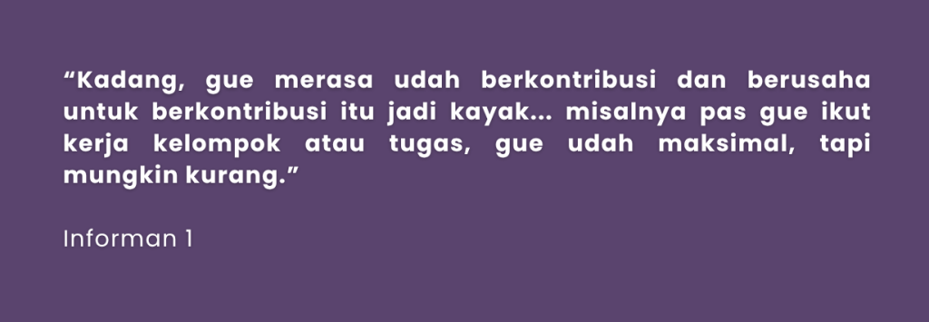 Informan 1 seringkali menunjukkan keraguan dalam kemampuan yang dimiliki, khususnya ketika berada dalam kelompok yang didominasi oleh individu-individu yang dianggap lebih kompeten. Kekhawatiran akan penilaian negatif dari anggota kelompok membuat Informan 1 memilih diam atau hanya menjalankan tugas teknis yang sederhana, tanpa berani menyuarakan ide atau mengambil inisiatif. Dalam pengakuannya, Informan 1 seringkali menyebut bahwa rasa takut “ide gue salah” atau “udah kepikiran orang duluan” mendorongnya untuk menahan diri.
