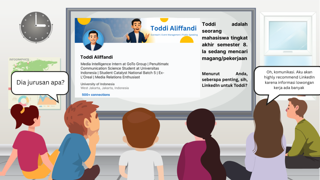 Gambar 2 menunjukkan situasi diskusi ketika diberikan studi kasus mengenai pengguna LinkedIn bernama Toddi. Para mahasiswa langsung menanyakan latar belakang jurusannya. Begitu mengetahui bahwa Toddi berasal dari Ilmu Komunikasi, mereka serempak menilai bahwa LinkedIn akan relevan baginya karena ketersediaan informasi seputar karir di bidang komunikasi yang berlimpah di platform tersebut. Keyakinan ini diperkuat FIK (22 tahun, Jurusan Teknik Industri), mahasiswa rumpun ilmu Sains dan Teknologi yang menyatakan LinkedIn sangat mendukung pengembangan karirnya. Banyak teman satu jurusannya yang dihubungi langsung oleh perekrut melalui LinkedIn. Berdasarkan temuan tersebut, keyakinan terhadap efektivitas LinkedIn dipengaruhi oleh sejauh mana informasi yang disediakan relevan dengan konteks dan kebutuhan masing-masing rumpun ilmu yang berbeda.
