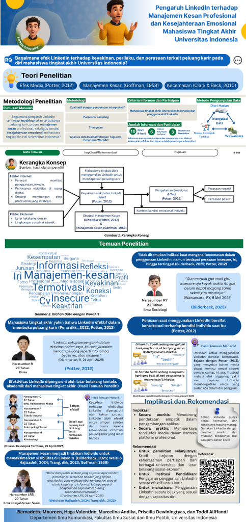 Apakah kamu familiar dengan potongan kalimat “I’m happy to announce—”? Jika iya, mungkin karena kamu adalah bagian dari 26 juta pengguna LinkedIn di Indonesia (Scuderia, 2024). Tak seperti media digital lainnya yang didominasi konten hiburan, LinkedIn dirancang untuk menghubungkan pencari kerja dengan perekrut serta menawarkan peluang dan informasi yang membuatnya semakin populer di kalangan mahasiswa dan lulusan baru (Muhamad, 2023). Namun, penelitian terdahulu ternyata menunjukkan adanya kecenderungan munculnya dampak negatif dari penggunaan LinkedIn kepada pengguna, seperti tekanan emosional (Bilderback, 2025), stres, kecemasan, dan penurunan suasana hati (Jones dkk., 2016). Melihat hal tersebut, apakah LinkedIn serta merta hanya menjadi sumber perasaan negatif bagi para mahasiswa tingkat akhir?