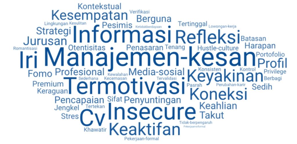 “Aku bukan tipe orang yang akan ngerasain emosi tersebut secara berlarut, justru dari rasa ketidakpercayaan diri tersebut, aku jadi termotivasi juga untuk benerin page LinkedIn, resume, cari info magang, dan melamar kalo ada kesempatan.”(Narasumber LRS, diari, 11 Mei 2025).