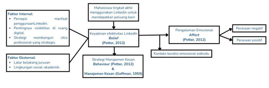 Tiga konsep utama, yaitu efek media(Potter, 2012), manajemen kesan(Goffman, 1959), dan kecemasan(Clark & Beck, 2010 dalam Jabeen dkk., 2023) digunakan dalam penelitian ini. Dengan kerangka efek media, penelitian ini mengeksplorasi tiga dimensi efek media secara spesifik, yaitu kepercayaan, perilaku, dan perasaan. Sedangkan, dengan manajemen kesan, penelitian ini hendak menelusuri bagaimana pengguna LinkedIn melakukan presentasi diri dan bagaimana presentasi diri yang terdapat di LinkedIn berdampak pada pengguna. Dengan adanya efek media dan manajemen kesan tersebut, penelitian ini juga hendak melihat bagaimana konsep ini dapat berlaku di antara kelompok mahasiswa tingkat akhir yang menggunakan LinkedIn.