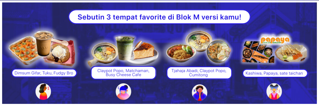 Blok M mampu menawarkan kombinasi yang sulit untuk diabaikan. Akses transportasi yang mudah dari berbagai daerah, berbagai pilihan tempat nongkrong, tempat kuliner yang berdekatan dan bahkan bisa ditempuh hanya dengan berjalan kaki. Kulinernya, mulai dari makanan berat, minuman kekinian, hingga dessertviral, semuanya hadir dalam satu kawasan yang sama dan terus bertambah. Hal ini membuat orang-orang yang datang ke Blok M untuk satu tujuan saja seringkali berakhir pada beberapa tujuan pemberhentian lainnya.