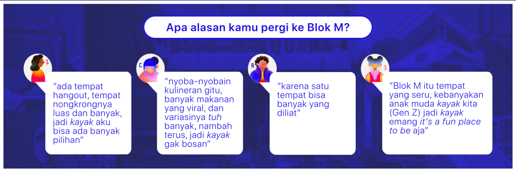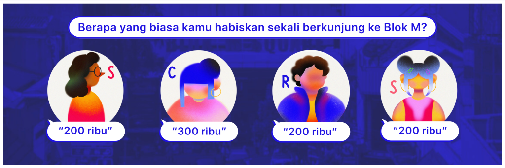 Berangkat dari data tersebut, tim kemudian melakukan wawancara bersama dengan 4 Gen Z yang aktif mengunjungi Blok M untuk memahami lebih jauh berapa pendapatan bulanan mereka dan bagaimana uang tersebut dihabiskan saat berkunjung ke Blok M.