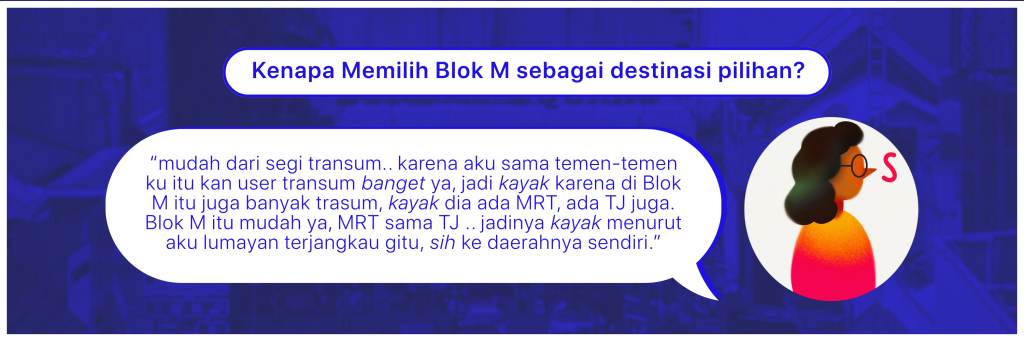 Salah satu narasumber mengungkapkan bahwa Blok M menjadi pilihannya karena kemudahan akses transportasi umum, terutama MRT. Faktor inilah yang menjadi daya tarik utama dan mendorongnya untuk terus kembali ke Blok M.